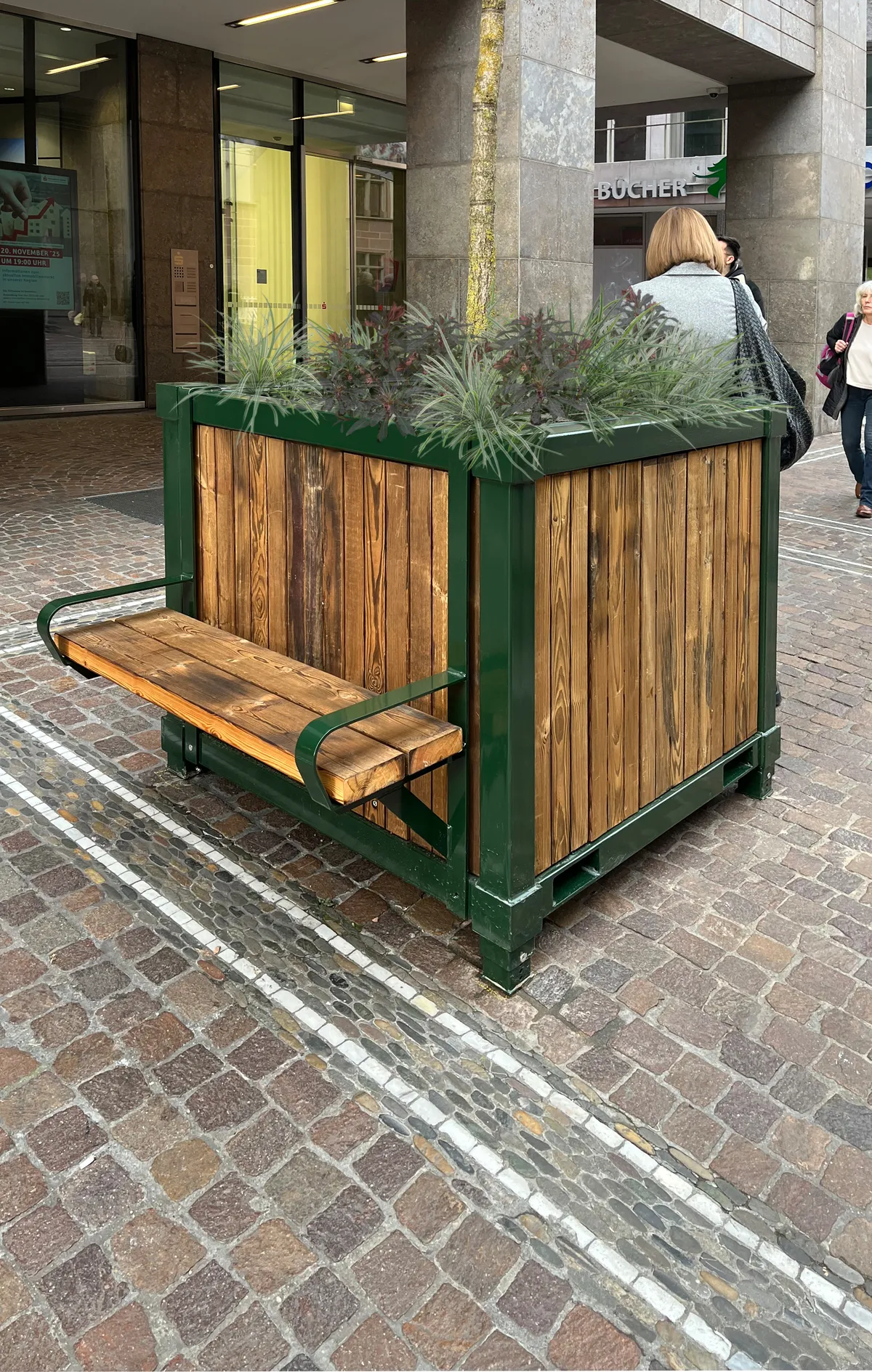 Die Grüninseln verbinden ökologische Qualitäten – wie verbesserte Mikroklimata und Biodiversität – mit einem sozialen Anspruch: Sie schaffen niederschwellige, zugängliche Orte zum Verweilen, Begegnen und Durchatmen. Die Elemente sind vielseitig kombinierbar und wurden präzise auf das städtische Bestandsmobiliar sowie auf das Farb- und Materialkonzept der Altstadt abgestimmt. Durch Baumpflanzungen, Stauden und schattige Sitzmöglichkeiten erschließen sie neue Potenziale im Stadtraum und verwandeln wenig attraktive Orte in angenehme Aufenthaltsplätze.